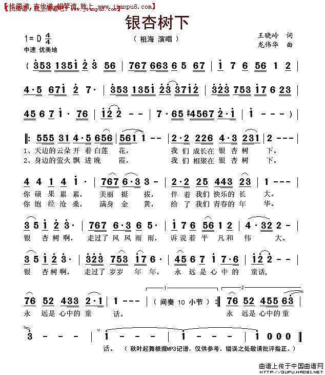 _131645.html附件:歌词 《银杏树下 》 演唱:祖海 词:王晓岭 曲:龙伟华 天边的云朵开