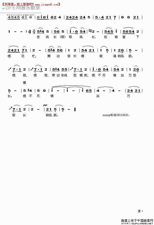 作词:王文忠 作曲:张立田 演唱:朱逢博 歌词提示:金线长银线长 姑娘窗下绣花忙 鲜花未开心花放哟吼咳。